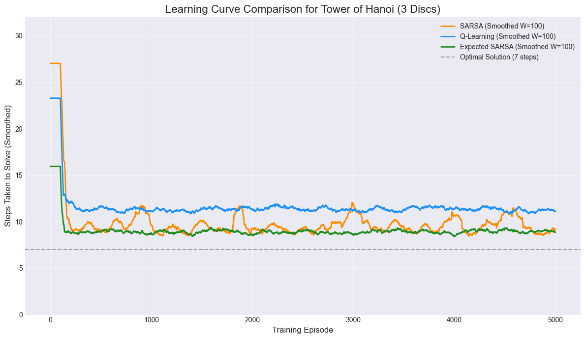 In this project, I explored the different foundation Reinforcement Learning (RL) algorithms - specifically Temporal Difference (TD) Q-table methods (SARSA, Q-Learning, Expected SARSA) and a Deep Q-Network (DQN) trained to solve the classic Tower of Hanoi puzzle. The objective is to compare their efficiency, convergence, and ability to find the optimal solution in this discrete action-space environment.