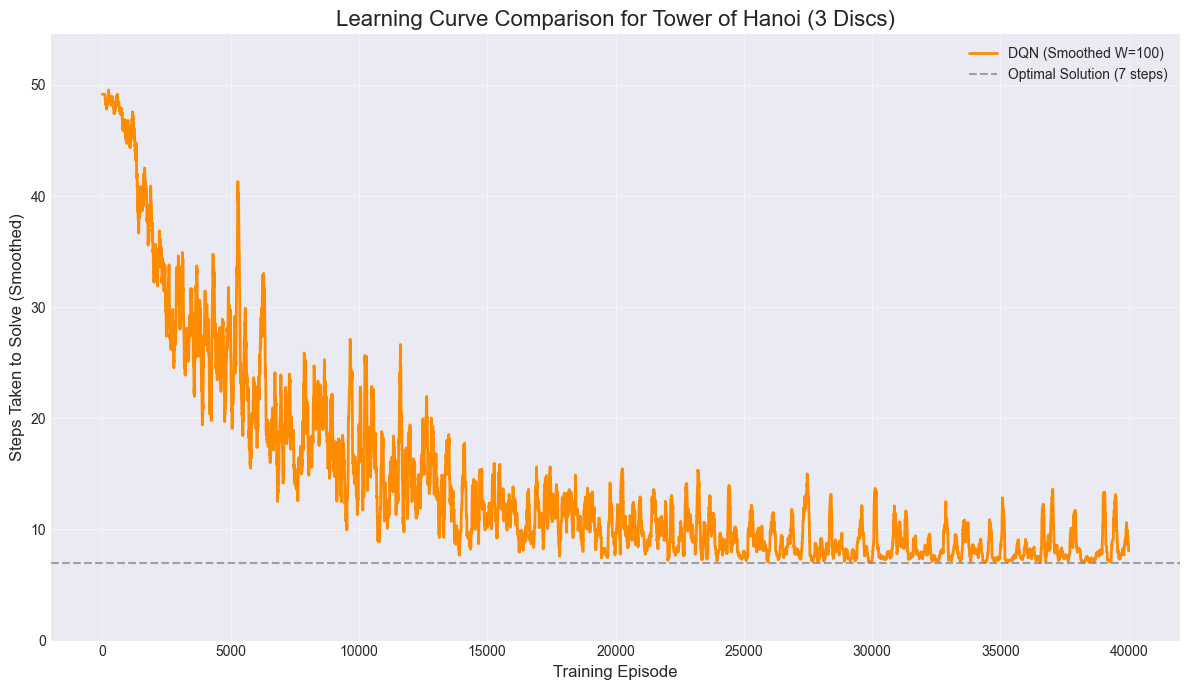 The problem has a well-known deterministic, optimal solution that requires $2^n - 1$ moves for $n$ disks. For example, a 3-disk problem requires $2^3 - 1 = 7$ moves. This optimal path provides a clear benchmark for our RL agents.